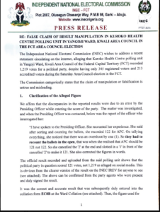 INEC Press Release – Re: False Claim of Result Manipulation in Kuroko Health Centre Polling Unit in Yangoji Ward, Kwali Area Council in the FCT Area Council Election