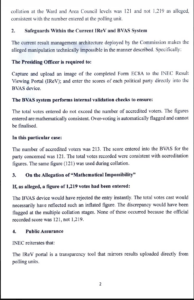 2. Safeguards Within the Current IReV and BVAS System The current result management architecture deployed by the Commission makes the alleged manipulation technically impossible in the manner described. Specifically: The Presiding Officer is required to:Capture and upload an image of the completed Form EC8A to the INEC Result Viewing Portal (IReV); and enter the scores of each political party directly into the BVAS device. The BVAS system performs internal validation checks to ensure:The total votes entered do not exceed the number of accredited voters. The figures entered are mathematically consistent. Over-voting is automatically flagged and cannot be finalised.In this particular case:The number of accredited voters was 213. The score entered into the BVAS for the party concerned was 121. The total votes recorded were consistent with accreditation figures. The same figure (121) was used during collation.